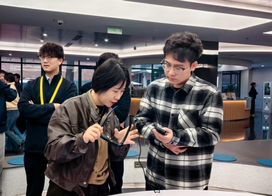 在坐观式内容测评实验室中,师生在现场工作人员的带领下,分组体验了影像技术内容,直观了解该技术给予的视听感受。在VR技术体验区,师生们戴上专业设备,瞬间"置身"于虚拟空间,直观体会到VR技术在影视叙事中的沉浸感以及塑造能力。而在动作捕捉实验室,通过现场志愿者演示,学生们直观的在显屏中看到实时动作反馈,对此表现出浓厚的兴趣,主动同工作人员请教动作捕捉精度优化、数据后期处理等专业问题。