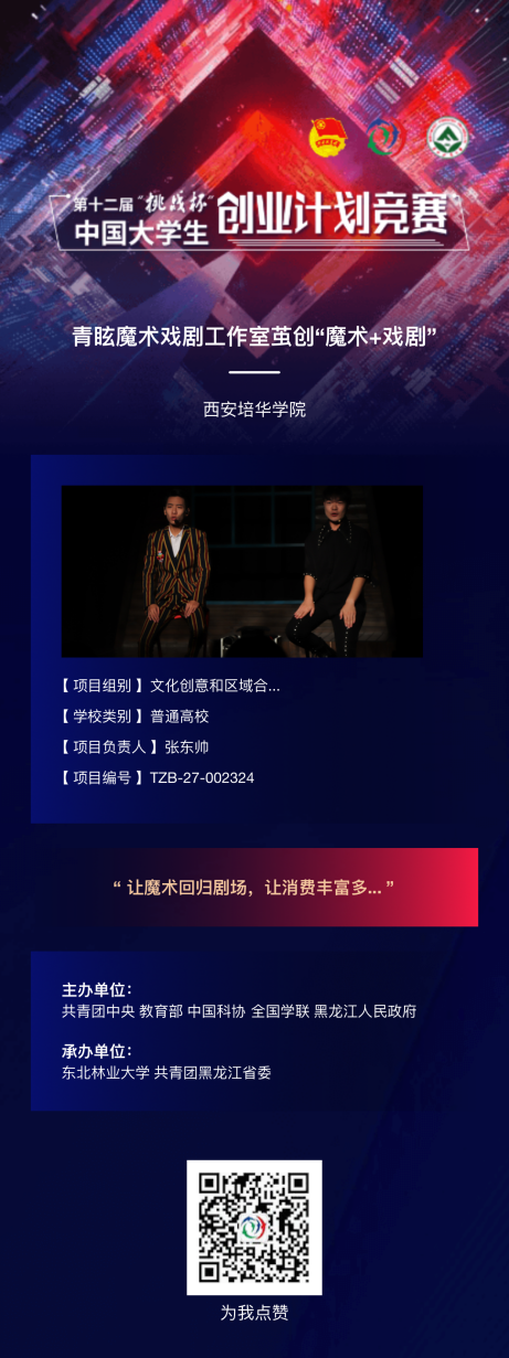 现在,他再一次整装出发,他领衔负责的项目《青眩魔术戏剧工作室茧创“魔术+戏剧”》在夺得第十届“挑战杯”陕西省大学生创业计划竞赛金奖后成功闯入国赛。