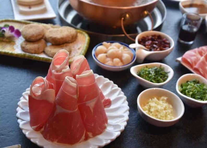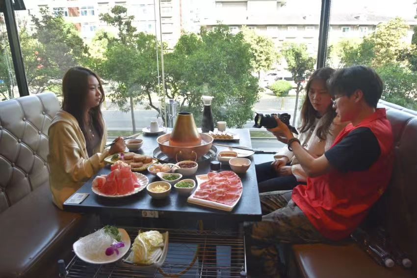 跟随镜头的转移,志愿者们来到京顺祥铜锅涮肉店内,该店坐落在朱雀门里,坐在窗边,可以看到西安的明城墙。店员介绍道,他们锅底都是使用农夫山泉水制作的清汤锅底,再用油泼辣段搭配上他们家的秘制芝麻酱料碗,味道一绝。芝麻烧饼也是他们家的特色,外脆里酥,芝麻酱的味道非常浓郁。