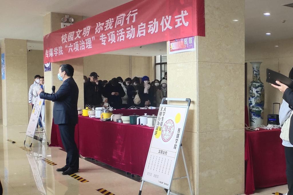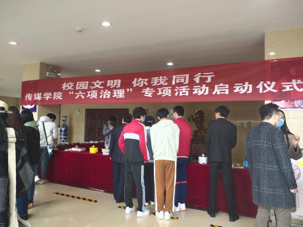 为了加强校园文明建设,增强学生文明意识,营造文明、和谐的育人环境。2022年11月17日上午,传媒学院在汇知楼阳光厅开展“六项治理”专项启动仪式。传媒学院行政副院长兼党总支书记江俊瑞,传媒学院团委副书记、学生会指导老师董俊凯以及学生代表刘诗睿参加此次仪式。