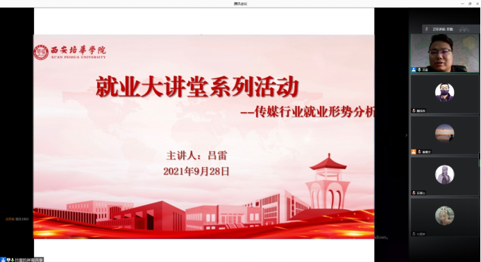 为了帮助传媒学院学生准确有效地确定就业方向,使学生们在思想上、行动上为未来就业提早做好准备,2021年9月28日14时,传媒学院邀请到陕西《三秦都市报》社房产建材事业部主任吕雷老师,通过线上会议的形式,进行了一场主题为“传媒行业就业形势分析”的主题讲座,讲座由西安培华学院传媒学院学生干事乔安老师主持,传媒学院各年级学生代表百余人参加了本次活动。