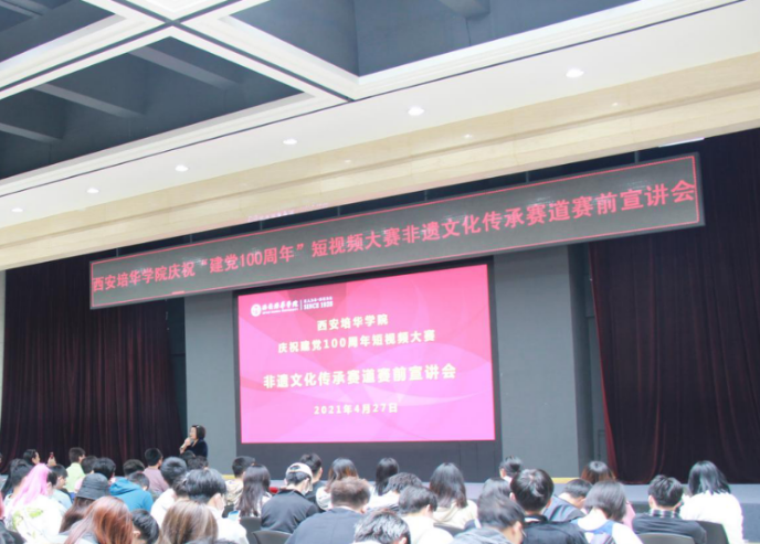 为庆祝中国共产党成立100周年,回顾党的光辉历程,讴歌党的丰功伟绩,展现我省聚力产业振兴、备战“十四运”的突出成果,推动全校上下开展弘扬传统文化、爱国主义教育,中共西安培华学院委员会主办,中共西安培华学院委员会宣传部、传媒学院承办正在举行“庆祝建党100周年短视频征集大赛”。本次赛事共分为四个赛道,为更好推动赛事,4月27日、28日赛事非遗文化传承赛道和创新创业赛道分别进行了主题宣讲。