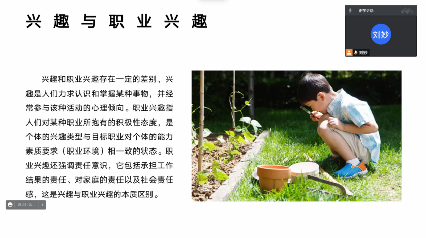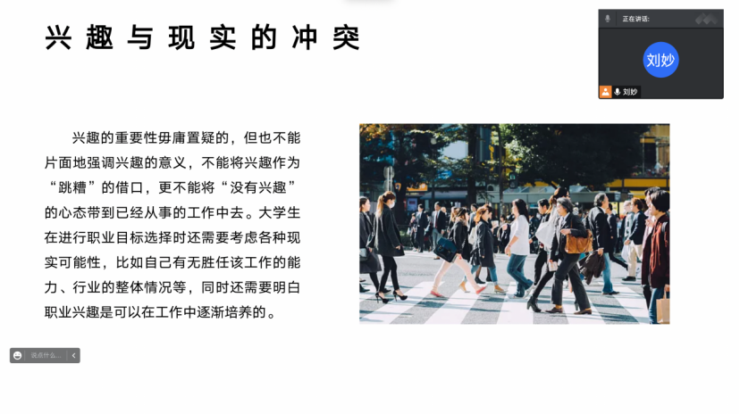 为了引导新传学子树立正确的择业观,正确了解新传系专业的就业前景、了解相关就业政策、助力毕业生的人生规划和职业发展,推进就业指导工作有序进行,12月16日下午四点,学业导师刘妙开展了2021级新传专业《职业生涯规划与就业指导》讲座,主题为:知己知彼知未来。就大学生认识自我、认识职业为切入点,为同学们详细讲解、深入剖析。