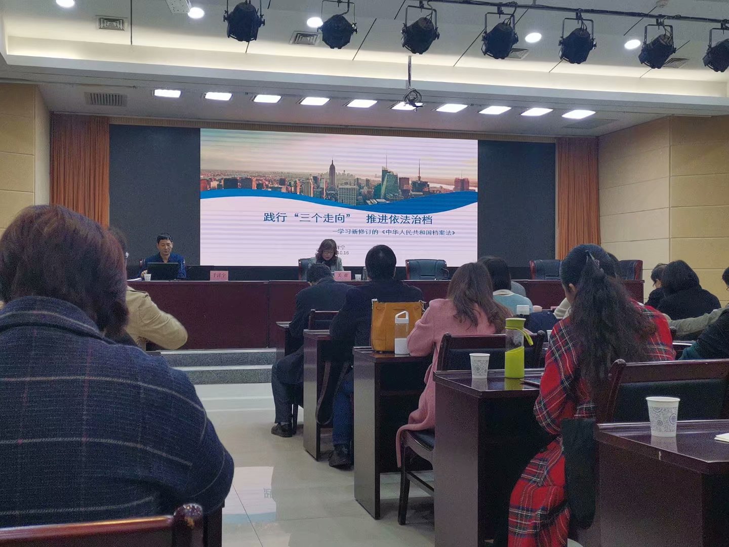10月16日上午,由陕西省教育厅、陕西省高教系统档案学会举办的学习贯彻新修订的《中华人民共和国档案法》报告会在省教育厅一楼会议室召开。报告会由省委教育工委、省教育厅二级巡视员关荷主持。省档案局事业发展处副处长于洋宁以《践行“三个走向”,推进依法治档案》为题对新修订的《档案法》进行宣讲。