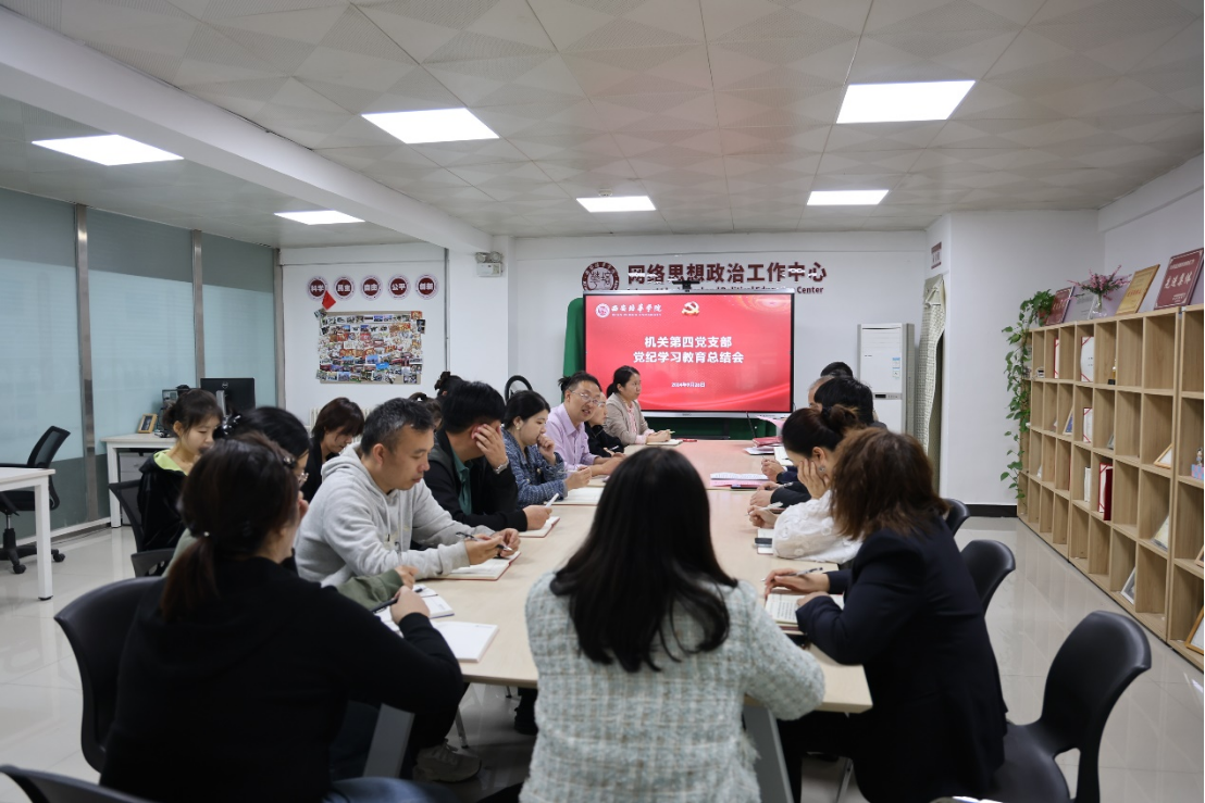 9月26日中午,机关第四党支部在明德楼二楼网络思想政治教育中心召开党委党纪学习教育总结会议,机关第四党支部23名党员参与学习,会议由机关第四党支部书记闵波主持。