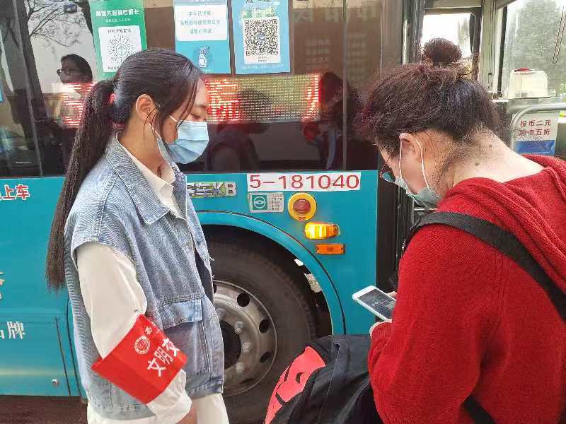 活动中,志愿者们戴着文明交通红袖章,耐心劝导过往群众走人行道、走斑马线,骑电动车规范佩戴安全头盔,严格遵守红绿灯等交通规则,提醒行人乘坐公共交通工具按照疫情防控要求,扫码佩戴口罩有序上车。
