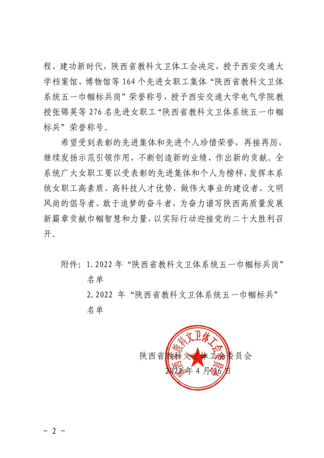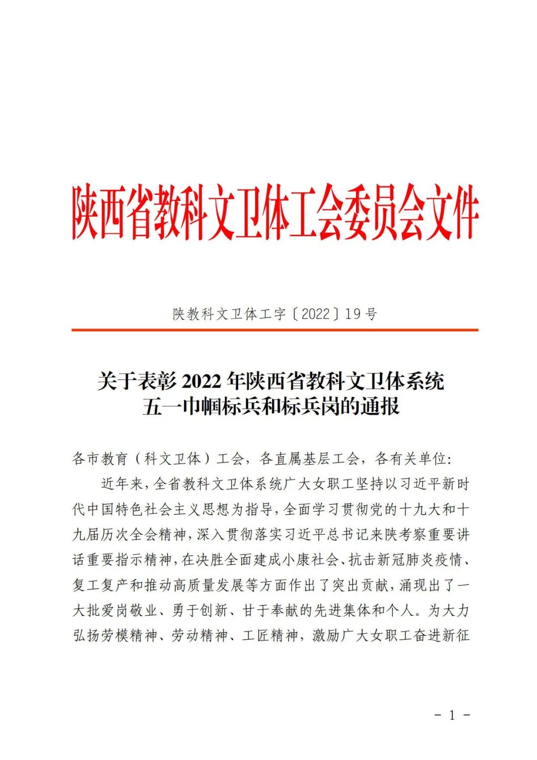 《关于表彰2022年陕西省教科文卫体系统五一巾帼标兵和标兵岗的通报》