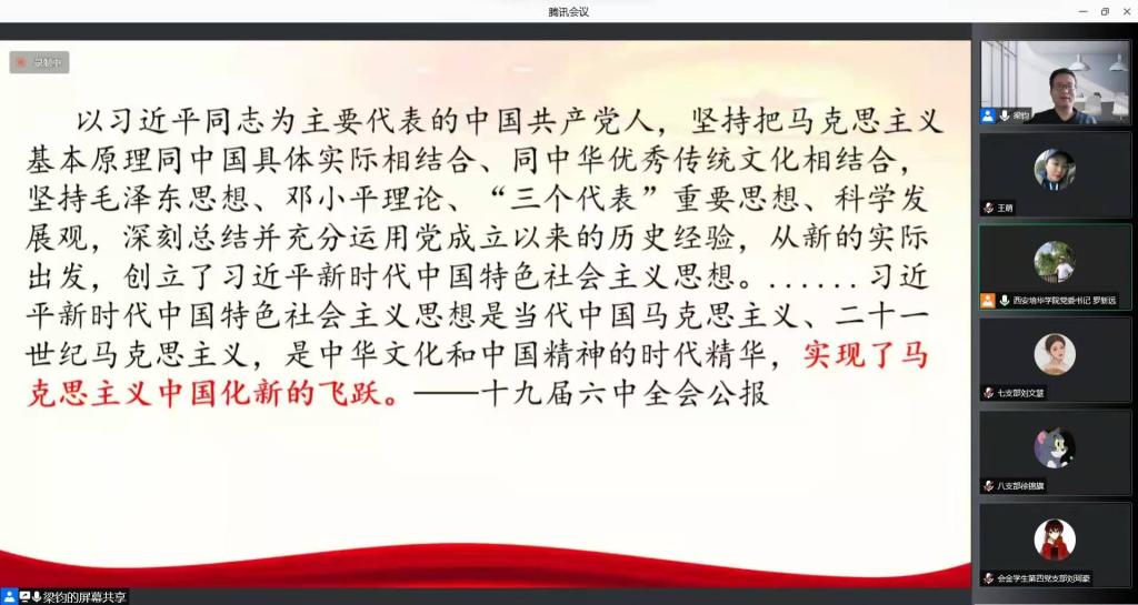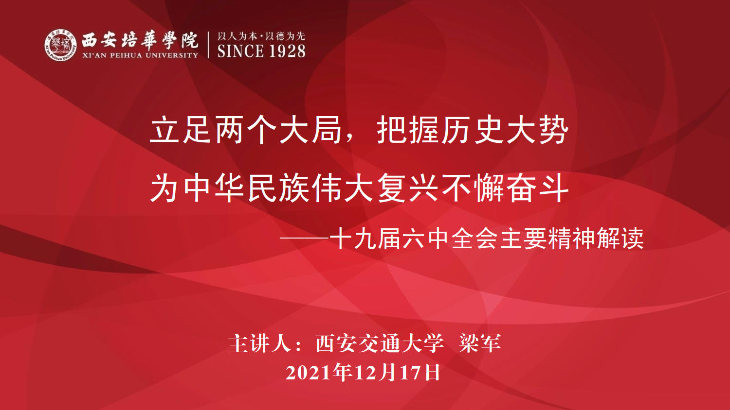 为全面解读、深入领会党的十九届六中全会精神,根据中共陕西省委教育工委 陕西省教育厅党史学习教育领导小组的工作安排,12月17日,我校特邀请省委教育工委、省教育厅宣讲团成员,西安交通大学教授梁军解读党的十九届六中全会精神专题报告。根据疫情防控工作的相关要求,报告会采取线上线下相结合的方式,300余名师生党员参加,报告会由校党委书记罗新远主持。