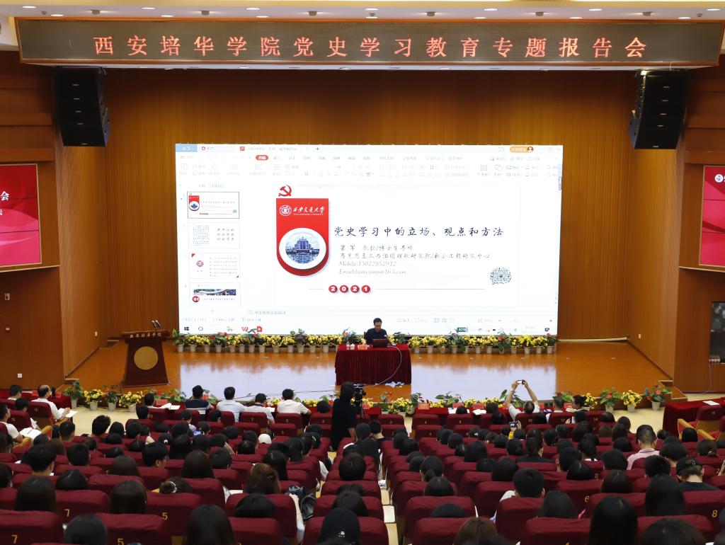 5月26日下午,西安交通大学教授、博士生导师梁军受邀来到西安培华学院作了以《党史学习中的立场、观点和方法》为题的党史学习教育专题辅导报告。西安培华学院领导班子成员,二级学院党委(党总支)书记、副书记,党务干事,党支部书记,直属党支部书记及各基层党组织委员,师生代表共计400余人现场聆听了报告。报告会由李映方校长主持。