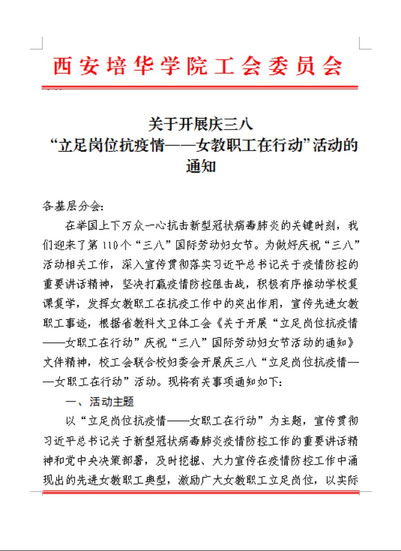 西安培华学院关于开展庆三八“立足岗位抗疫情—女教职工在行动”活动的通知