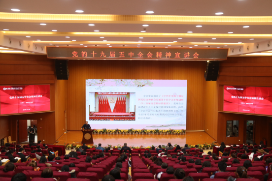 12月16日下午,学校举办学习贯彻党的十九届五中全会精神宣讲会,陕西高校党委宣讲团成员、校党委书记罗新远作题为《开启全面建设社会主义现代化国家新征程》的宣讲报告,党委理论学习中心组成员、各学院党委(党总支)书记、副书记、党务干事、学生代表200余人到场参加。校党委委员、党委学生工作部部长蔡亮主持报告会。