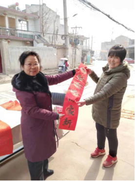 盟员王小慧老师(陕西省教育书法协会会员)、马惠明老师亲自给乡民们书写春联和福字。他们在红红的春联纸上挥毫笔墨尽显才艺,一个个苍劲灵动的福字,和一幅幅寓意祝福的春联一气呵成,吸引了很多的乡亲。刚刚写好的春联,散发着浓浓的墨香,喜迎新春翰墨飘香送祝福,让百姓们感受到了浓浓的新年气氛。福字代表了新年的美好祝愿。民盟培华支部所有的盟员也将在新的一年里,不忘初心,怀揣梦想,继续前行。