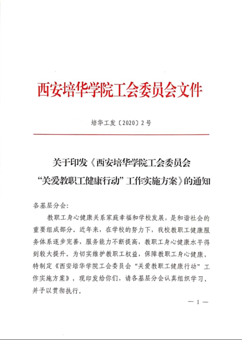 西安培华学院关于印发《西安培华学院工会委员会“关爱教职工健康行动”工作实施方案》的通知
