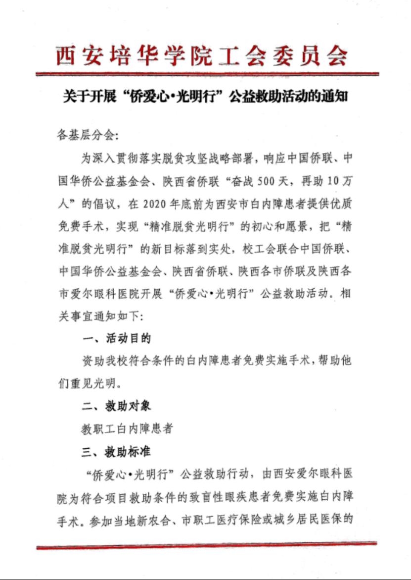 西安培华学院关于开展“侨爱心·光明行”公益救助活动的通知