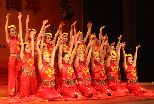 我校选送的秧歌舞《秦悦》 是由16名女教工结合陕西地域文化历时一个月自编自导完成的。舞蹈以陕西秧歌为主要元素,融进了民族和时尚元素,整个基调激情振奋。飞舞的红绸,奋进的舞步,无不展示着丰富浓郁的的秦人风采,也书写西安培华学院教职工的骄傲、喜悦和收获,更尽情地展示了西安培华学院创人民满意民办大学的时代风采,展现了陕西民办高等教育的绚丽与灿烂!