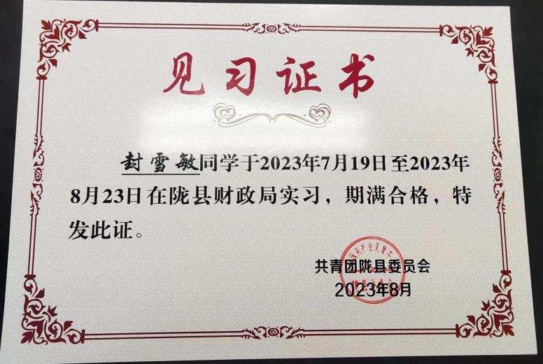 封雪敏于2023年7月19日至8月23日在陕西省宝鸡市陇县财政局挂职实践。在此期间,她学习各项财务制度,了解资金管理办法;深入宝鸡市青铜器博物馆、长乐塬抗战工业遗址及宝鸡市廉政教育基地参观学习,进一步了解加强党风廉政建设的重要意义。“见习过程中能够收获同事们的认可和鼓励是对我最大的肯定和动力。这段经历让我更加明确了未来的发展方向和目标,为此我会继续努力,不断进步,提升自己。”