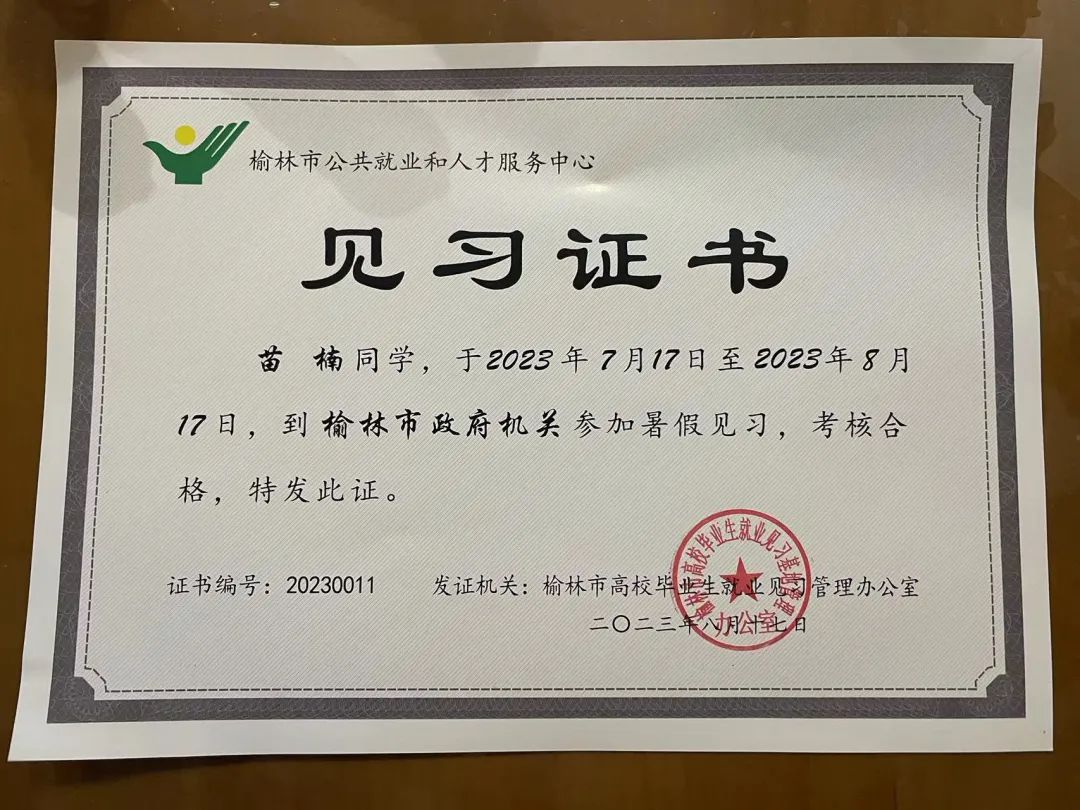 苗楠于2023年7月17日至8月17日在陕西省榆林市体育局政秘科实践。他说见习经历拉近了他与社会之间的距离,让自己在工作生活中开拓了视野,增长了才干。“我逐渐转变了原有的学生思维!现在知道需要主动做事,要学会用‘猎人的眼光’观察工作事务,主动求学。我总是以‘第一天参加工作’的态度来要求自己,更加严谨细致对待工作!”