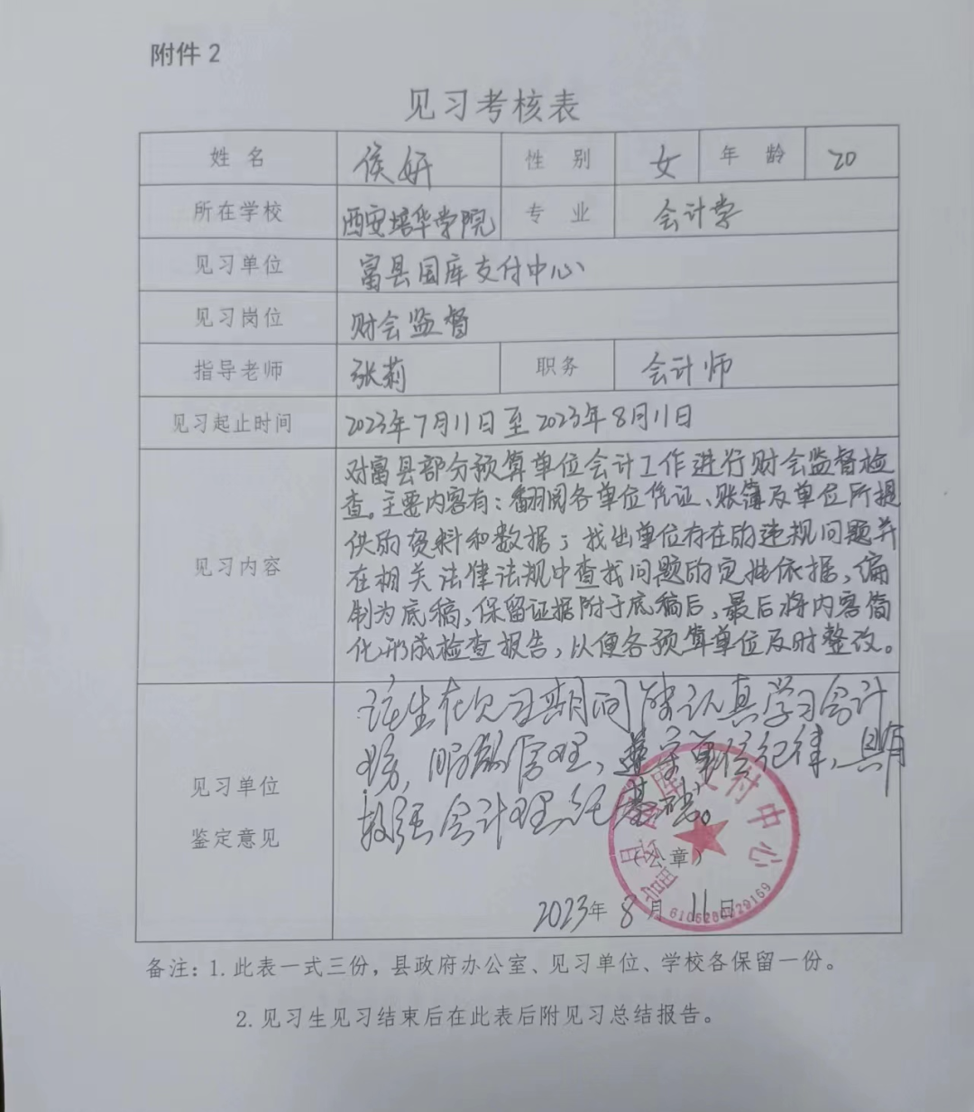 侯妍于2023年7月11日至8月11日在富县国库支付中心财会监督岗位挂职实践,负责对富县部分预算单位会计工作进行财会监督检查,需要翻阅各单位凭证、账簿及单位所提供的资料和数据;找出单位存在的违规问题并在相关法律法规中查找问题的定性依据,编制为底稿;最后将内容简化形成检查报告,以便各预算单位及时整改。“实践是检验真理的唯一标准。这次见习让我的财会知识体系更加完整,锻炼了交流沟通能力,为以后工作提供了坚实的基础。”