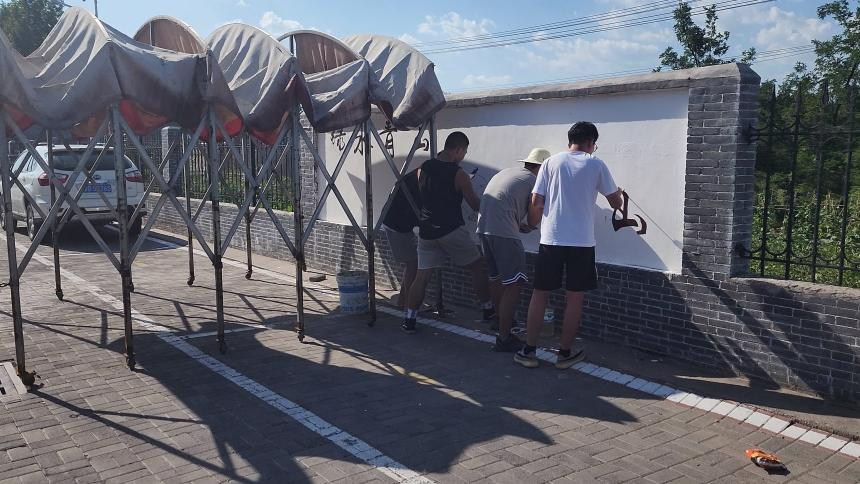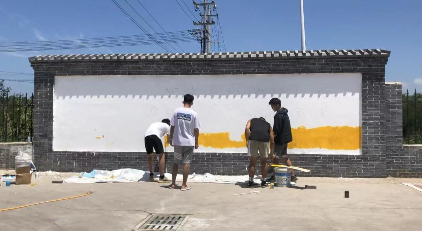 由于当地大雨,在休整两日并在当地购买墙绘工具之后,西安培华学院建筑与艺术设计学院2020级环境设计专业的青年学子们于7月4日早晨赶到了渠街村。当地的村支书及村民十分配合我们的工作,给我们提供了外接水管、遮阳搭棚、木板等工具。我们深深感受到当地村民的淳朴热情,也下定决心不能辜负乡亲们的好意。为了自己,为了团队,为了学校,也为了给予西安培华学院建筑与艺术设计学院2020级环境设计专业的青年学子们帮助的村民们,我们要交出一份满意的答卷,让他们和我们都能有所收获。