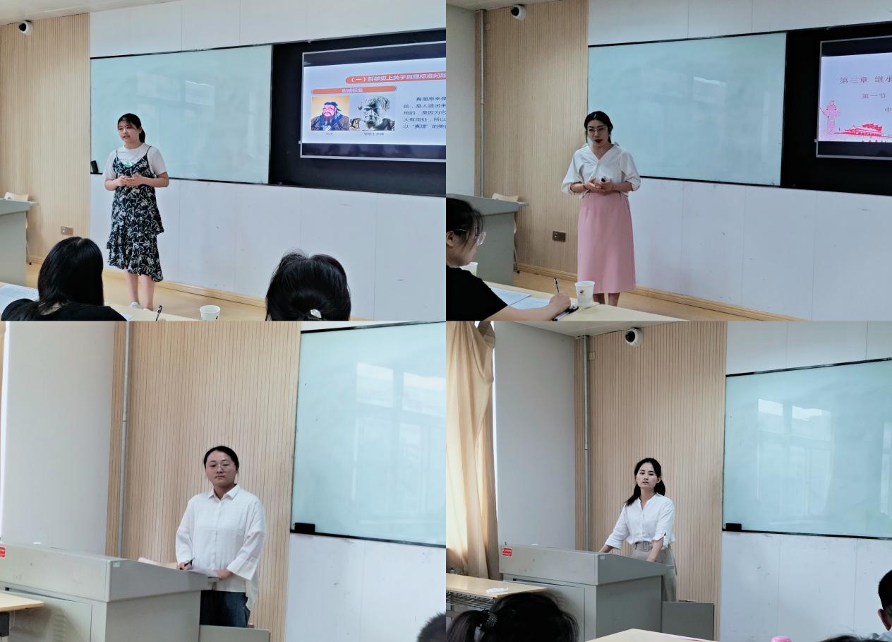 邓如琪老师讲授了《马克思主义基本原理》课程中的“真理的检验标准”部分,阐述了哲学史上关于真理标准问题的争论、真理与价值、实践是检验真理的唯一标准等内容。李燕妮老师讲授了《思想道德与法治》课程中“继承优良传统 弘扬中国精神”的内容。刘静静老师讲授了《思想道德与法治》课程中“担当复兴大任,成就时代新人——我们处在中国特色社会主义新时代”的内容,强调青年作为时代新人,要不断提升思想道德素质和法治素养。朱亚琪老师讲授了《马克思主义基本原理》课程中的“马克思主义为什么行?”的内容。