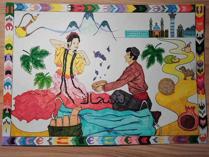 艾德莱斯绸的边框围绕着生活的新篇章。丝绸之路使新疆瓜果飘香。天山脚下秀美英俊的维吾尔族姑娘小伙能歌善舞,勤劳奋斗。他们热情又好客,他们用最美的舞蹈,他们用最动听的歌声,他们用最美味的食物,来欢迎各族人民。这里是新疆,也是我的家乡,这里的美更是疫情也遮不住的家乡美。