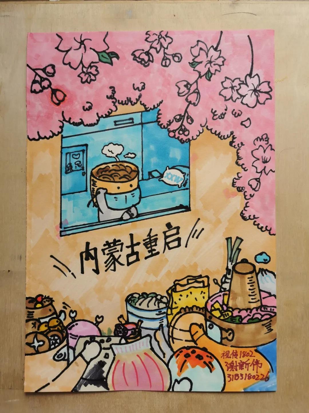 这是以"内蒙古重启"为主题的手绘疫情遮不住的家乡美。这一年我们在不安定中懂得了什么叫珍惜。疫情下,全体内蒙古自治区人民众志成城,万众一心。一场突如其来的疫情,给我们带来了沉重的打击,让内蒙古整座城市变得更加齐心协力。疫情隔离了我们的距离,但遮不住我们家乡的美。在我心中内蒙古重启指日可待。马上回到喧闹的生活。我以内蒙古各种美食为代表,以拟人的手法表现出大家期望的生活。希望内蒙古早日重启。中国加油。