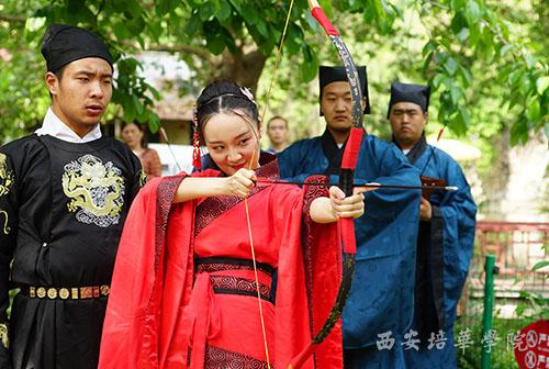成人礼仪式结束之后,进行了成人礼射。射,乃古代六艺之一,古书有云:“君子无所争,必也射乎,揖攘升,下面饮,其争也君子”,射礼体现了中国传统文化中“立德正己,礼乐相合”及“发而不中,反求诸己”的深刻内涵。