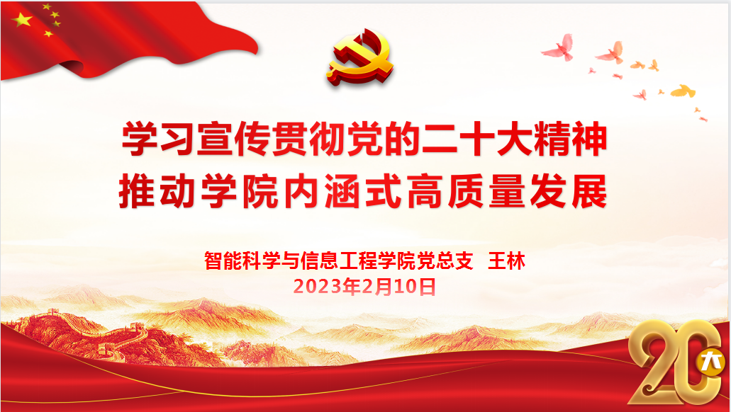 为深入学习宣传贯彻党的二十大精神,智能科学与信息工程学院党总支书记王林于2023年2月10日在育英楼3502教室召开“学习宣传贯彻党的二十大精神,推动学院内涵式高质量发展”专题党课,全院教职员工参加了此次党课学习。