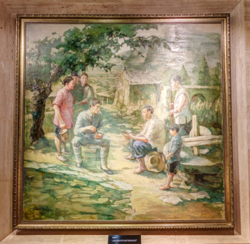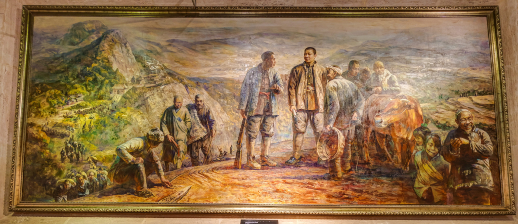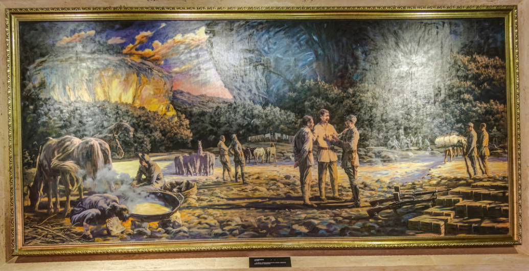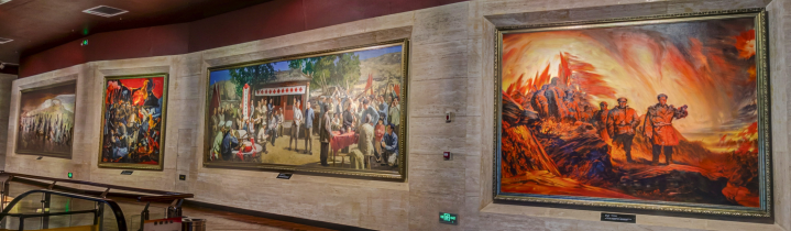 二楼专题展区外部长廊的一侧墙壁上,陈列着由西安美术学院完成的革命题材油画作品。主题油画映初心,“照金精神”在传承。在纪念馆内,十五幅巨幅油画作品用厚重的笔触和浓重的色彩,描述出以照金为中心的陕甘边革命根据地所发生的重大革命事件,用艺术的手法呈现了历史场景,将老一辈无产阶级革命家坚韧不拔的信念和为真理献身的决心跃然纸上。