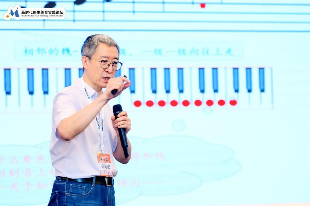 著名音乐美学家、音乐心理学、教育学家、中央音乐学院教授、博导周海宏老师在本次论坛开模式上演讲,主题为《音乐审美活动的心理过程与教育要点》周老师在案例《寻找乐器之王》的分享中,展示了儿童节奏、音色、乐器选择教学方法,与会老师化身一年级学生,以跟随周海宏老师互动、学习,以《两只老虎》为例,通过整合迁移,循环强化教学进行五线谱教学,使儿童识谱能唱歌,看谱能赏乐。同时,周海宏老师从符号对应学习,记忆强化理论、平面空间直觉特征……一系列心理学学历理论,为大家详细建构分解了识谱教学、和旋教学步骤。,周海宏教授针对目前我国基础音乐教育一次次“零基础起步”的现状,提出迈入新时代的音乐美育,从教育的目标到教学方法,都应该有所变革,有所突破。
