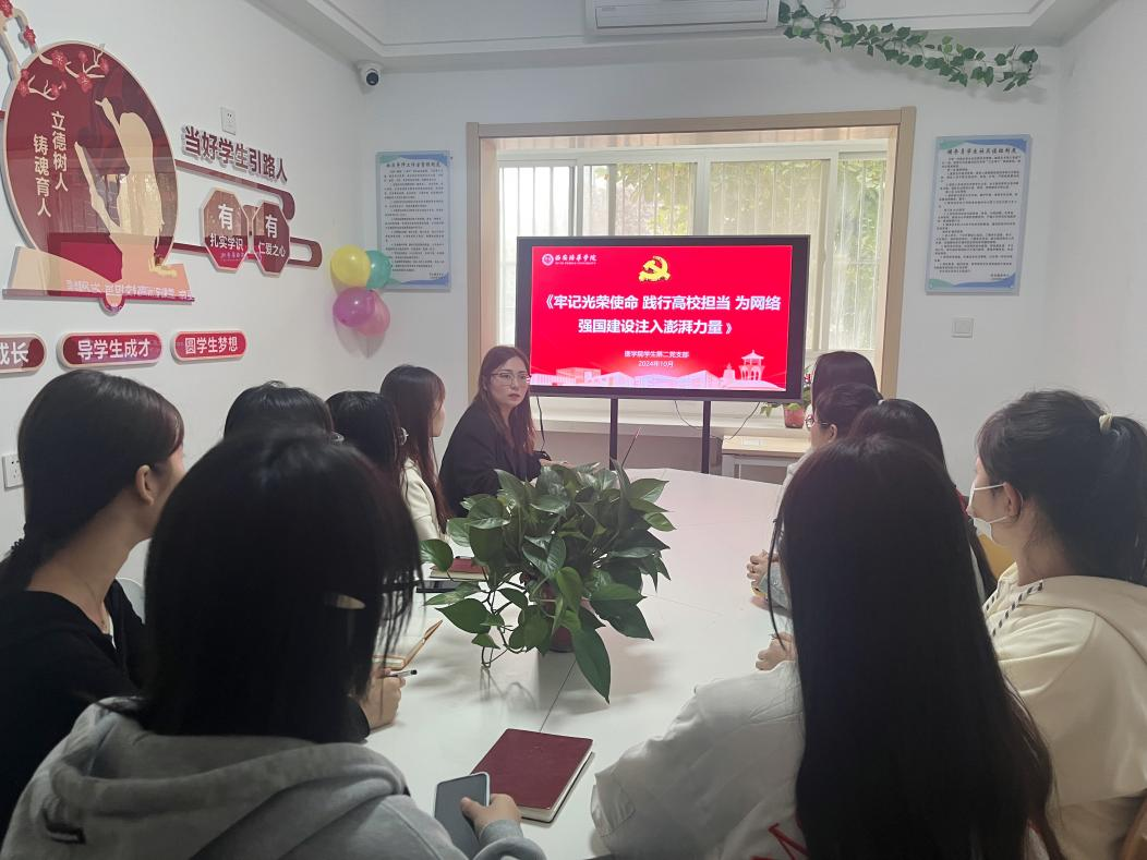 在新中国成立75周年之际,为进一步激发和展示高校广大师生奋进强国新征程的强大力量,深入学习习近平总书记关于网络强国的重要思想,牢记高校的使命和担当。10月11日下午4点,医学院学生第二党支部组织全体党员、积极分子通过线上+线下的方式准时收看高校党组织示范微党课第七讲《牢记光荣使命 践行高校担当 为网络强国建设注入澎湃力量》。