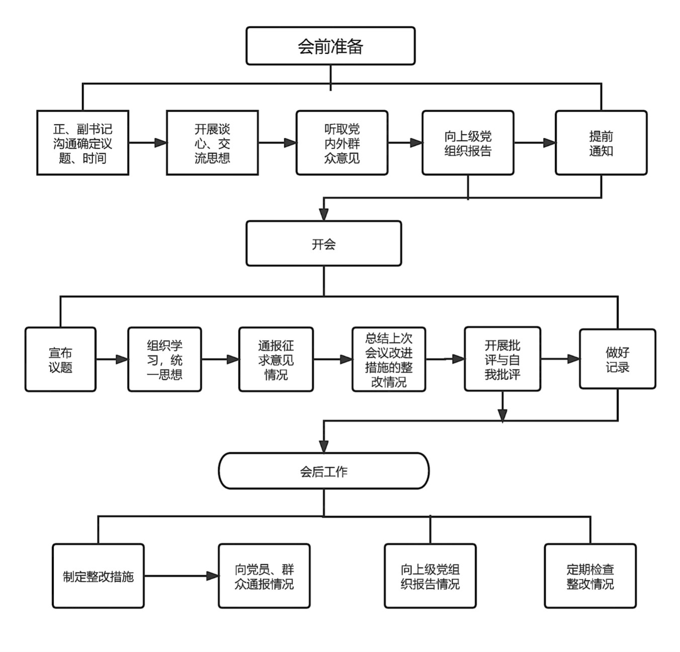 5.主要负责人总结会议情况,制定整改措施。对检查和反映出来的问题,领导班子及其成员应当制定整改措施,确定整改目标和完成时限。对群众反映强烈的突出问题进行专项整治。需要上级党组织帮助解决的,应当及时向上级党组织报告。反映领导班子成员的违纪问题,由党的纪律检察机关处理。