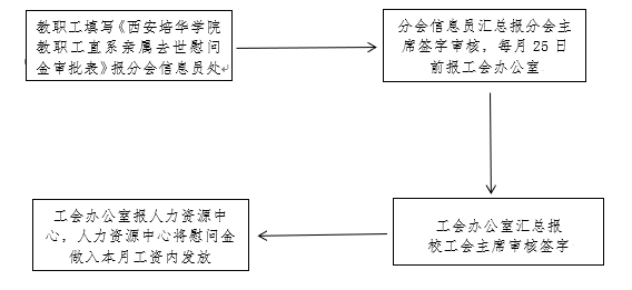 教职工填写《西安培华学院教职工直系亲属去世慰问金审批表》当月报分会信息员汇总后,分会主席审批,各分会每月25日前报工会办公室,经校工会主席审批后由人力资源中心将慰问金做入本月工资发放。