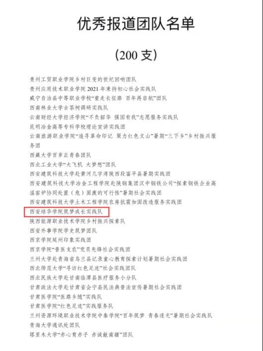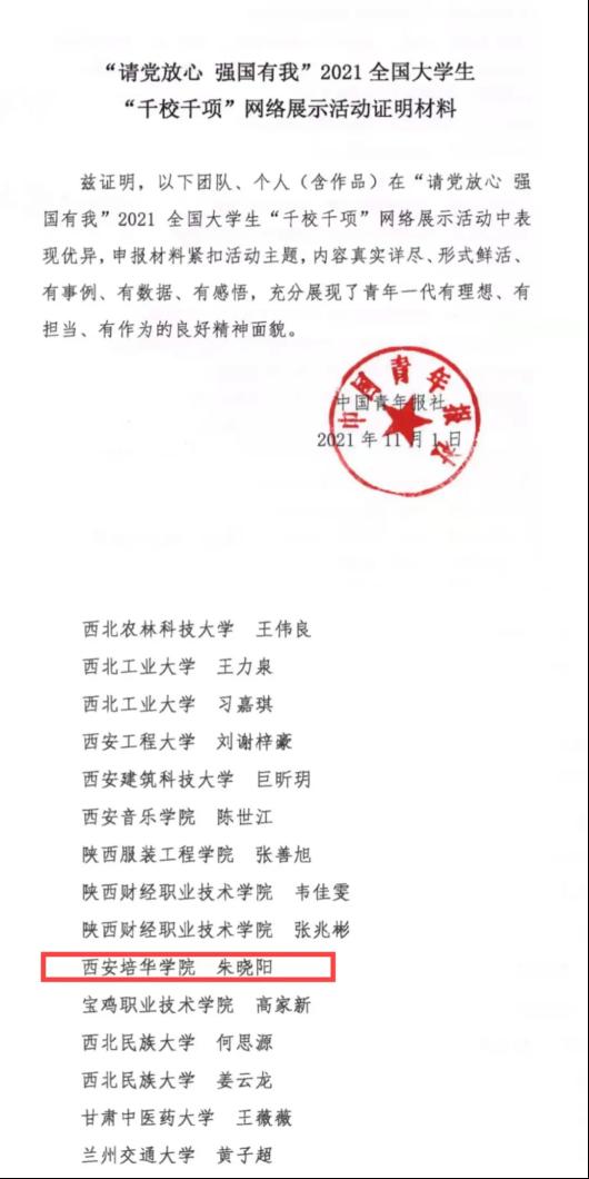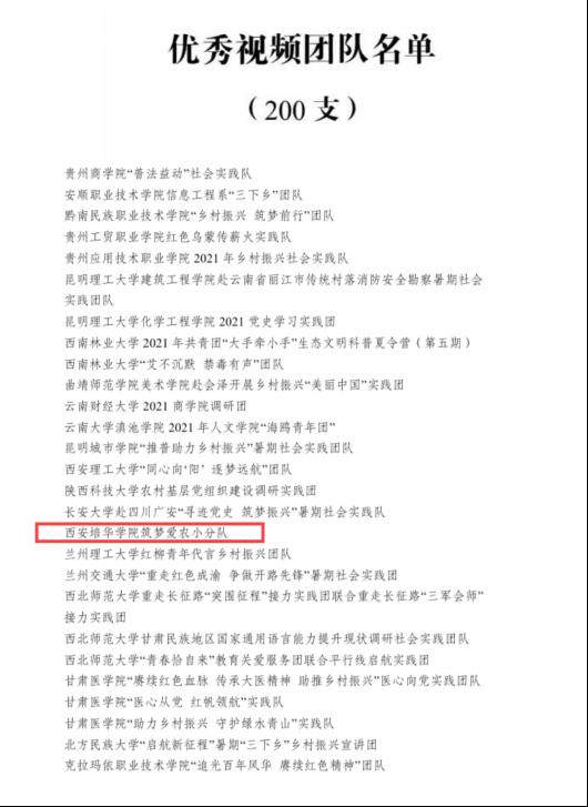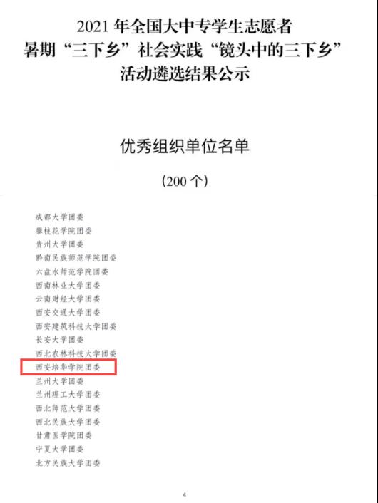 为充分宣传和展示2021年全国大中专学生志愿者暑期“三下乡”社会实践活动成果,团中央青年发展部、中国青年报、中国青年网共同举办2021年全国大中专学生志愿者暑期“三下乡”社会实践“镜头中的三下乡”成果遴选和“千校千项”成果遴选活动。其中,西安培华学院团委获2021年“镜头中的三下乡”优秀组织单位荣誉称号,学校筑梦成长实践队获“镜头中的三下乡”优秀报道团队荣誉称号,筑梦爱农小分队获“镜头下的三下乡”优秀视频团队荣誉称号,医学院青歌志愿服务队朱晓阳同学获“千校千项”社会实践先进个人荣誉称号。