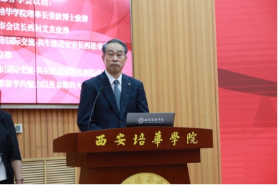 In his address, Mr. Jiang Bo, the Trustee, welcomed the delegation from Kyoto City and offered congratulations on the 50th anniversary of the friendship between Xi'an and Kyoto. He expressed the hope for strengthened exchanges between young people of China and Japan in the future, and for enhanced interactions and cooperation between the institutions of higher education in Xi'an and Kyoto, as well as between Xi'an Peihua University and universities in Kyoto.