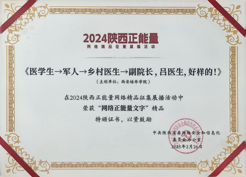 On February 26, the Shaanxi Provincial Cyberspace Affairs Office held the 2025 Online Propaganda Work Promotion Conference and presented certificates and trophies to the winners of the 2024 Shaanxi Positive Energy Online Excellence Awards. Xi'an Peihua University's work,"Medical Student → Soldier → Rural Doctor → Vice President, Dr. Lu, You're Amazing!", won the "Positive Energy Online Text" award in the 2024 Shaanxi Positive Energy Online Excellence Collection and Exhibition Activity.