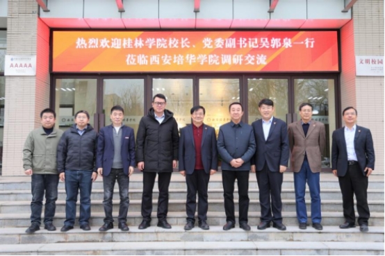 On the afternoon of March 14th, Wu Guoquan, President and Deputy Secretary of the Party Committee of Guilin University, led a delegation to conduct an exchange visit to the university. Yang Jiefu, Director of the Center for Industry-University Integration and Innovation Entrepreneurship of Guilin University, and Deputy Director of the Academic Affairs Office; Li Hongbo, Dean of the School of Science and Engineering and Director of the Network and Informationization Department of Guilin University; Liu Lianglong, Vice Dean of the School of Science and Engineering, and Zhu Xinbo, Director of the Electronic Information Engineering Teaching and Research Office of the School of Science and Engineering; Li Yingfang, President of Xi’an Peihua University; Tie Wei, Director of the Academic Affairs Management Center; Wang Wenqing, President of the Intelligent Science and Engineering School, and Xu Jin, Director of the Electronics Department, participated in the symposium. The meeting was chaired by Assistant President Bao Wei.
