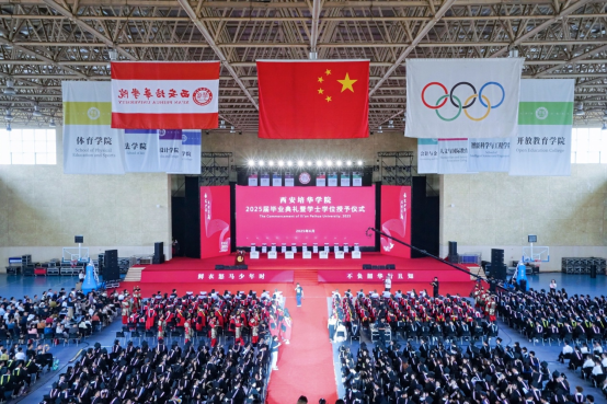 As the summer solstice arrives and all things flourish, Xi’an Peihua University held its 2025 Commencement and Bachelor’s Degree Conferral Ceremony on the morning of June 21 at the gymnasium of the Chang’an Campus. Over 2,000 attendees—including university leadership, members of the Academic Degree Committee, faculty representatives, counselors, parents of graduates, alumni, and representatives of the Class of 2025—gathered to witness this milestone moment. The ceremony was co-hosted by Dong Ying, Secretary of the University Youth League Committee, and Dou Baokuo, a 2025 graduate from the School of Media and Design.