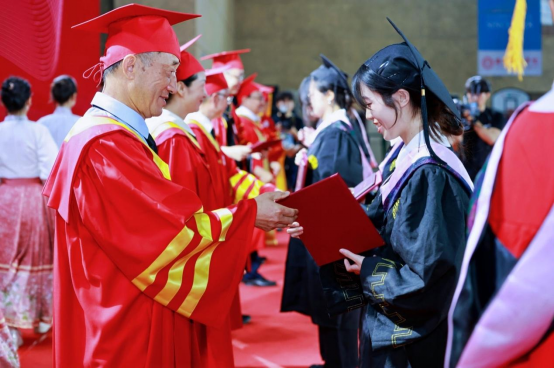 At the conclusion of the speech, graduate representatives, dressed in traditional Hanfu, performed the “Shu Xiu” ceremony for the Chairman—a time-honored ritual of offering gifts to one’s teacher. The gesture symbolized their deep respect for their mentor and heartfelt blessings for their alma mater.