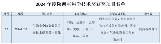 Recently, the Shaanxi Government announced the Decision on the 2024 Shaanxi Provincial Science and Technology Awards. Dr. Liu Yi’s team from the School of Medicine at Xi’an Peihua University was awarded the Third Prize of the 2024 Shaanxi Provincial Science and Technology Progress Award for their project titled Key Technology Development and Industrialization of Biosafety Defense Equipment. This achievement marks a significant breakthrough for the university in receiving government-level awards in the natural sciences category.