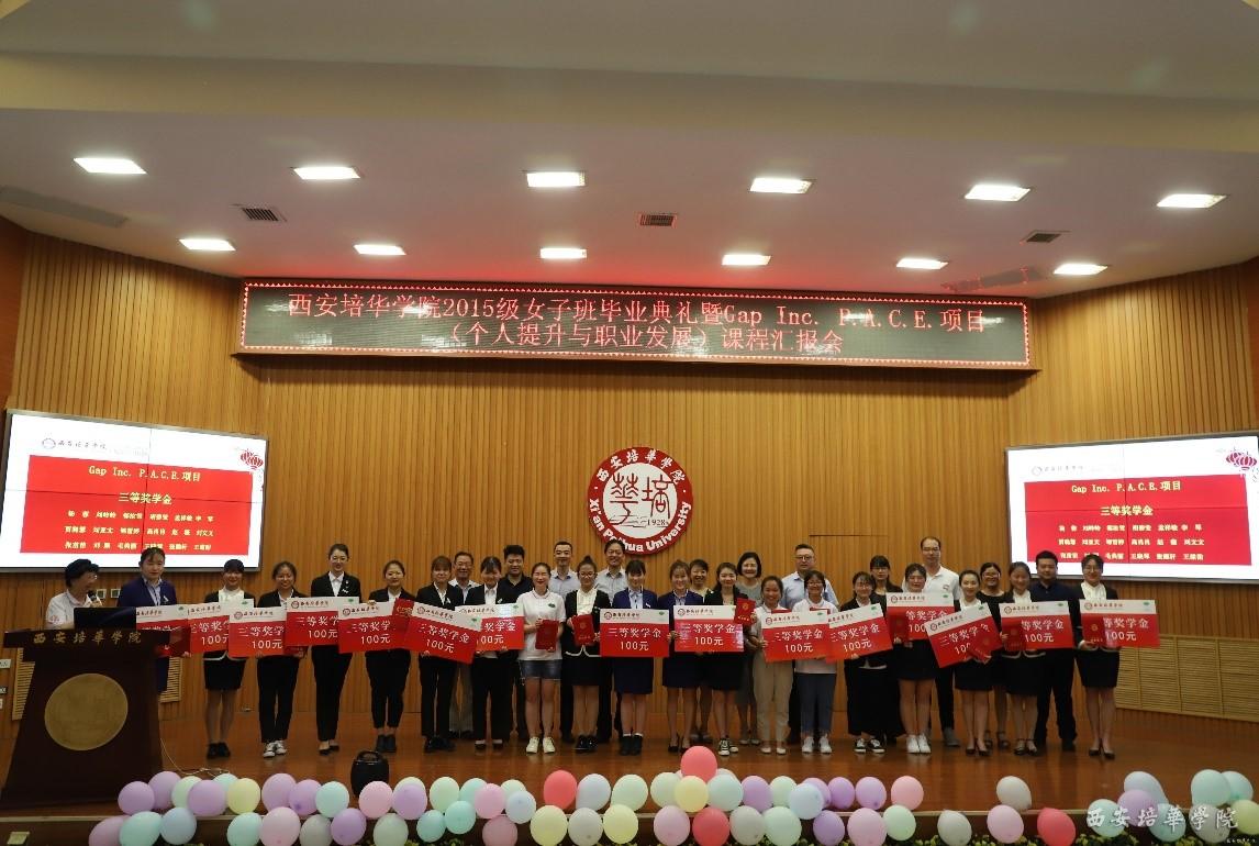 会上,为2015级女子班的毕业生代表颁发了结业证书,为国际合作项目的Gap Inc. P.A.C.E.课程个人和优秀团队分别颁发了一二三等奖奖学金和结业证书。