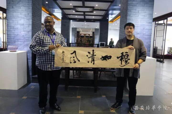 同学们一对一全程陪同来宾参观,为他们提供翻译服务。来宾们先后参观了图书馆、校史馆,在校史馆王鹏主任讲解了我校历经沧桑、自强不息的办学历史和历届师生锐意进取、艰苦创业的奋斗历程。亚非青年代表们被我校的百年建校历史所深深吸引,被我校深厚的历史文化底蕴所折服。随后来宾们在艺术馆体验了书法写作并收到我校教师今城昭二、陈鹏涛等送出的书法作品。