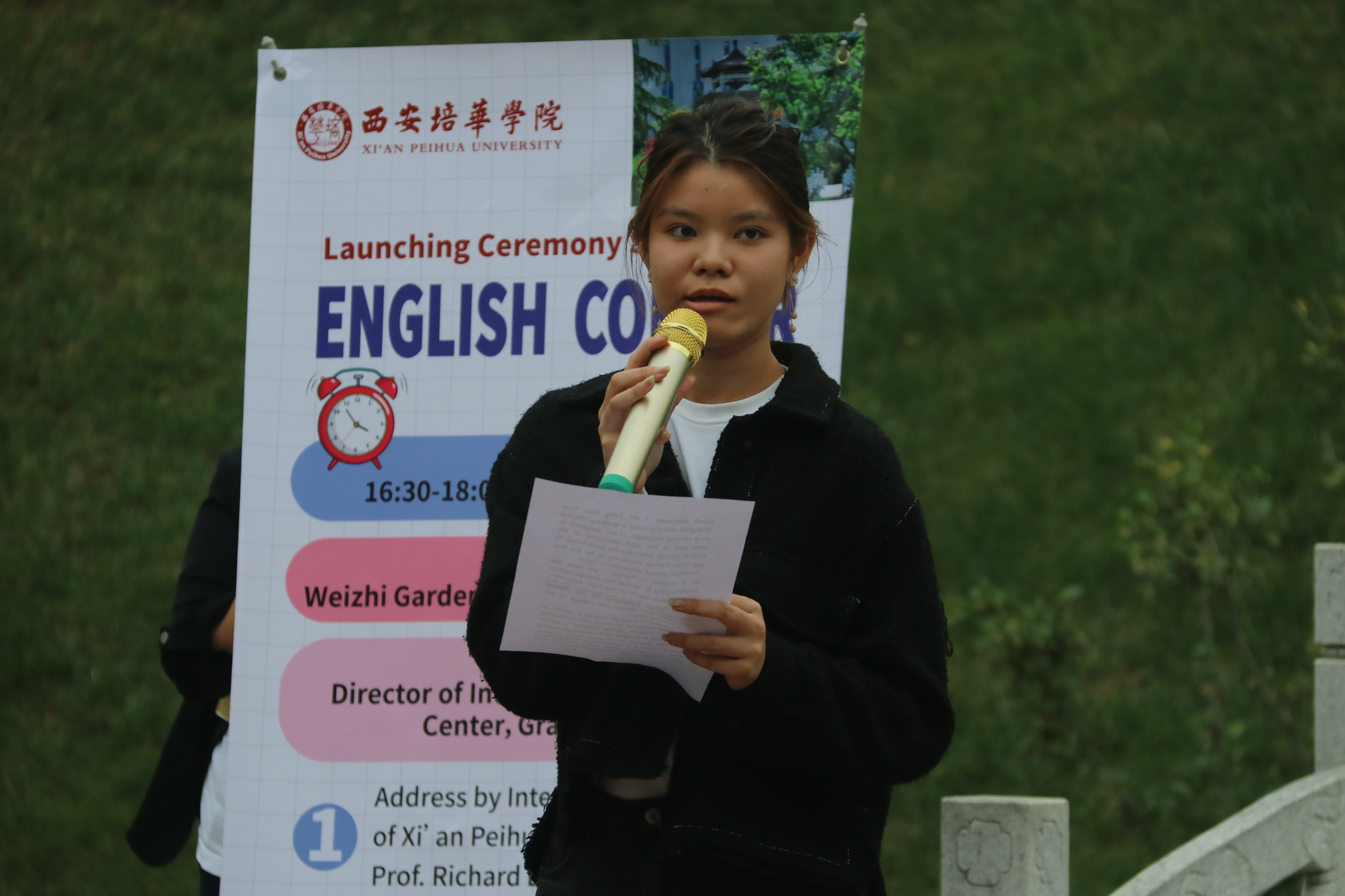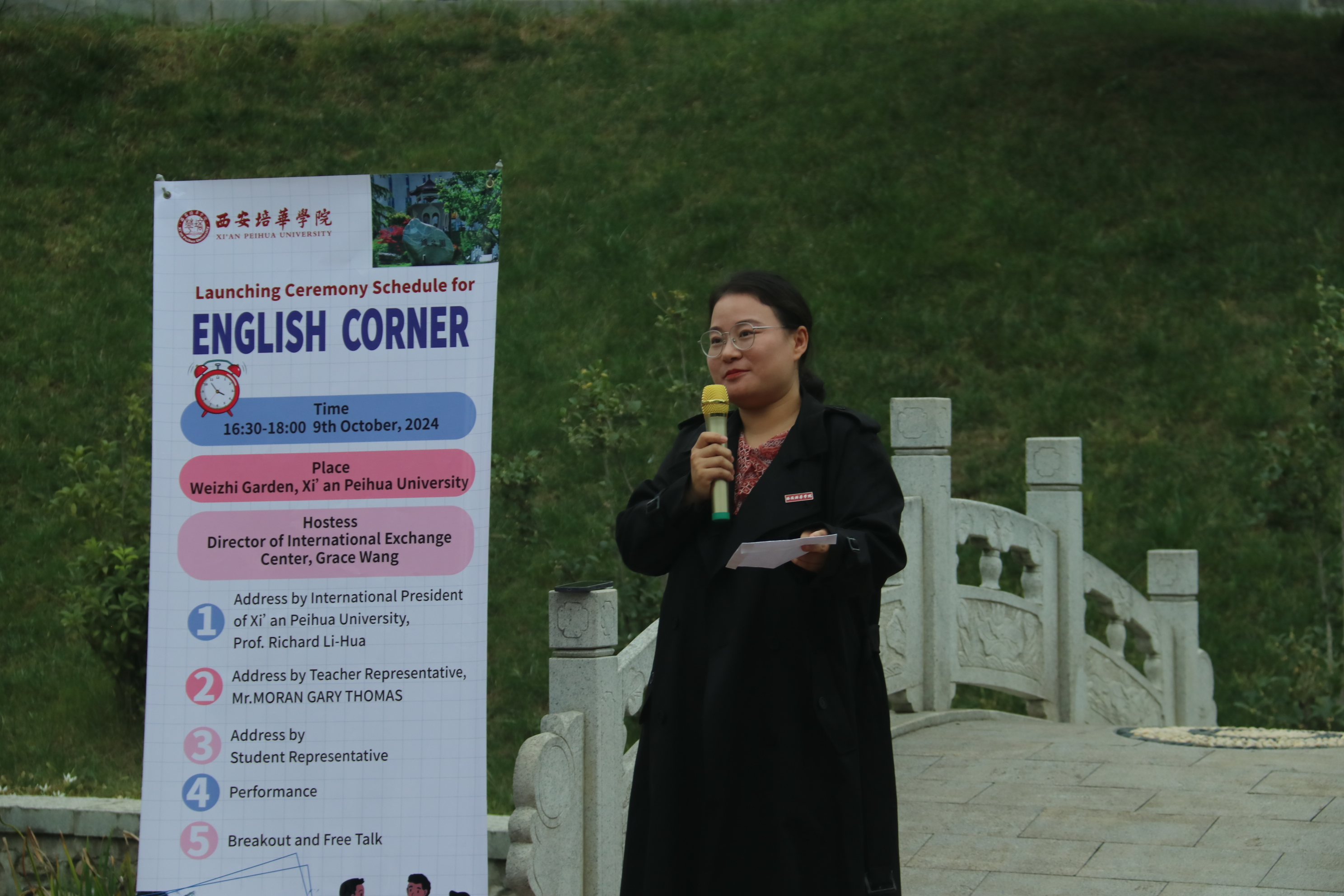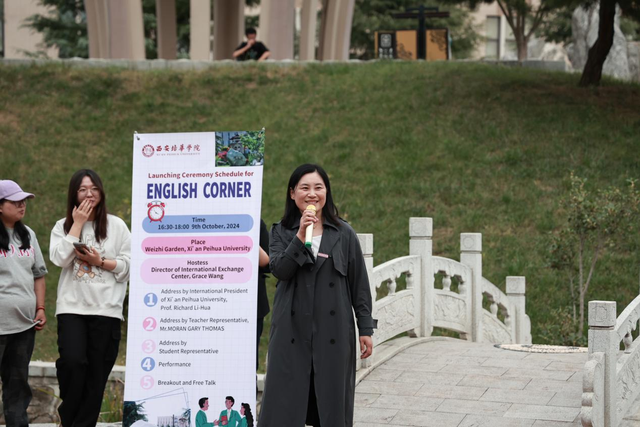 In the golden autumn of October,the heady fragrance of laurel blossoms waswafted through the fresh air.On the afternoon of October 9th, Professor Li Hua, International President of Xi'an Peihua University, Wang Peng, Director of the International Exchange Center of Xi'an Peihua University, Liu Gailin, Deputy Director of the Academic Affairs Management Center, MoranGaryThomas, a foreign teacherofXi'an Peihua University, along with representatives of teachers and students from the Elite Class, gathered together to witness a significant event aimed at stimulating enthusiasm for English learning and enhancing cultural exchanges—the launching ceremonyof the "English Corner".Theceremonywas hosted by Wang Peng, Director of the International Exchange CenterofXi'an Peihua University. She welcomed the students participating in the event and introduced that the purpose of this activity was to provide a platform for students to practice their spoken English and broaden their international horizons, thereby further promoting the internationalization process of theschool.