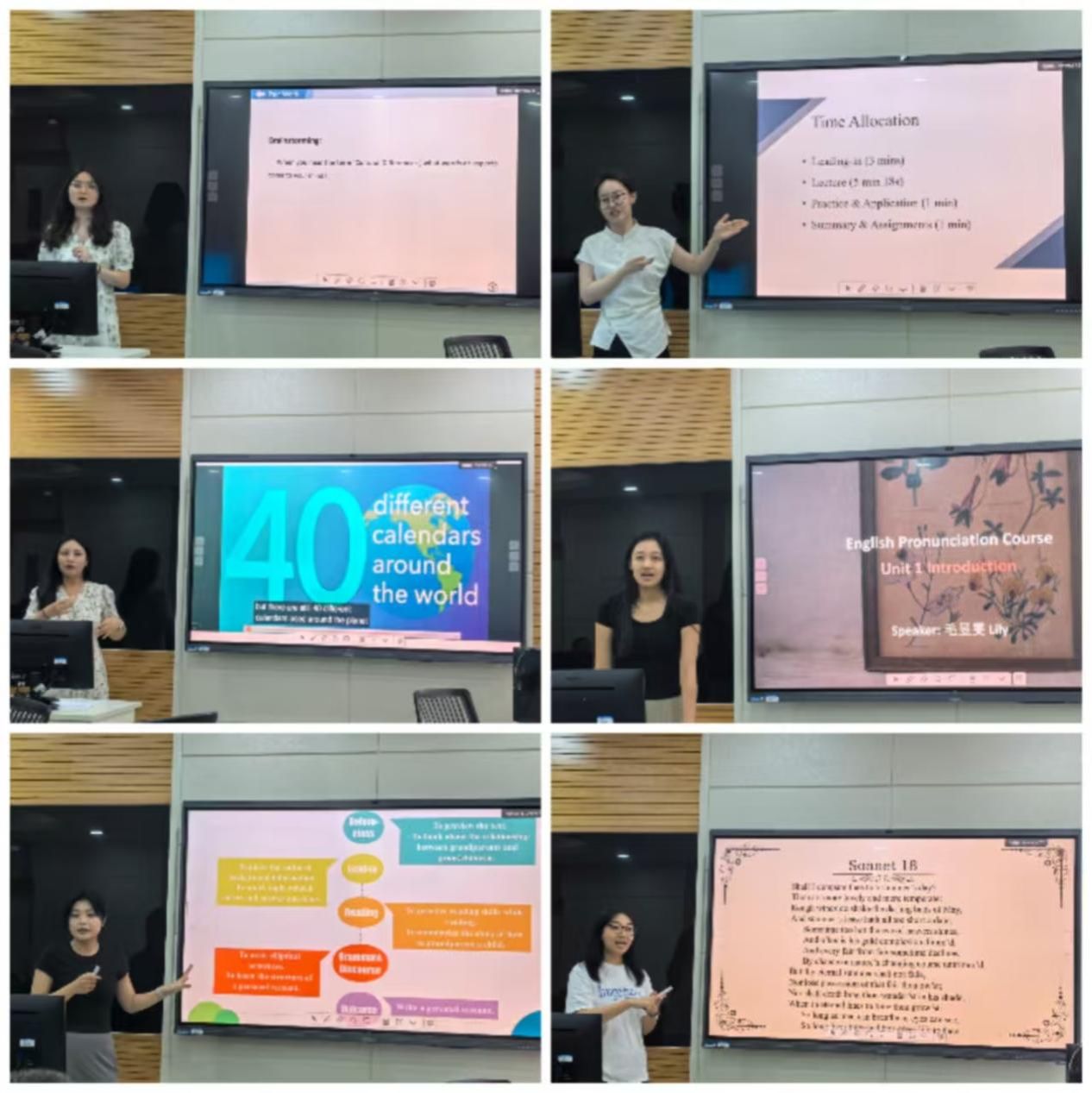 本次活动由外语系十余名青年教师进行课程展示,磨课分为“课前准备、现场展示、同行评议、专家点拨、反思修改”等多个环节。在现场展示环节,教师们依次登台,进行了时长3分钟的说课与10分钟的片段教学展示。