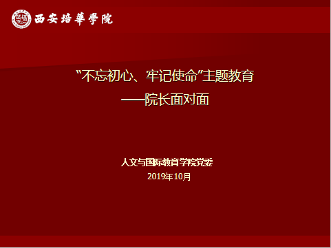 为了积极响应不忘初心、牢记使命主题教育中关于问题检视的要求,持续推进学院院长面对面座谈活动,进一步完善学院学风建设、解决学院切实需求,人文与国际教育学院于10月11日14:00举办了院长面对面座谈会,座谈会在格物楼党员活动室进行。西安培华学院党委委员、人文与国际教育学院常务副院长梁蕊,教工第三党支部部分党员老师及部分群众教师参加了本次座谈会,参会人员涉及教师、教学干事、学生干事、行政干事等不同类别的人员。座谈会由西安培华学院党委委员、人文与国际教育学院常务副院长梁蕊主持。