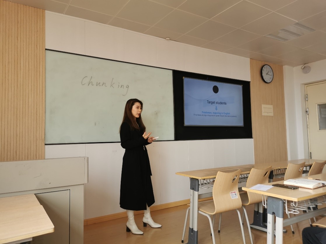 随后,是崔子钰老师《英语语音》课程的公开课,通过对比学生与教师之间英语发音的区别界定了英语语音中Chunking(意群)的概念,详细讲解了意群的定义与应用。