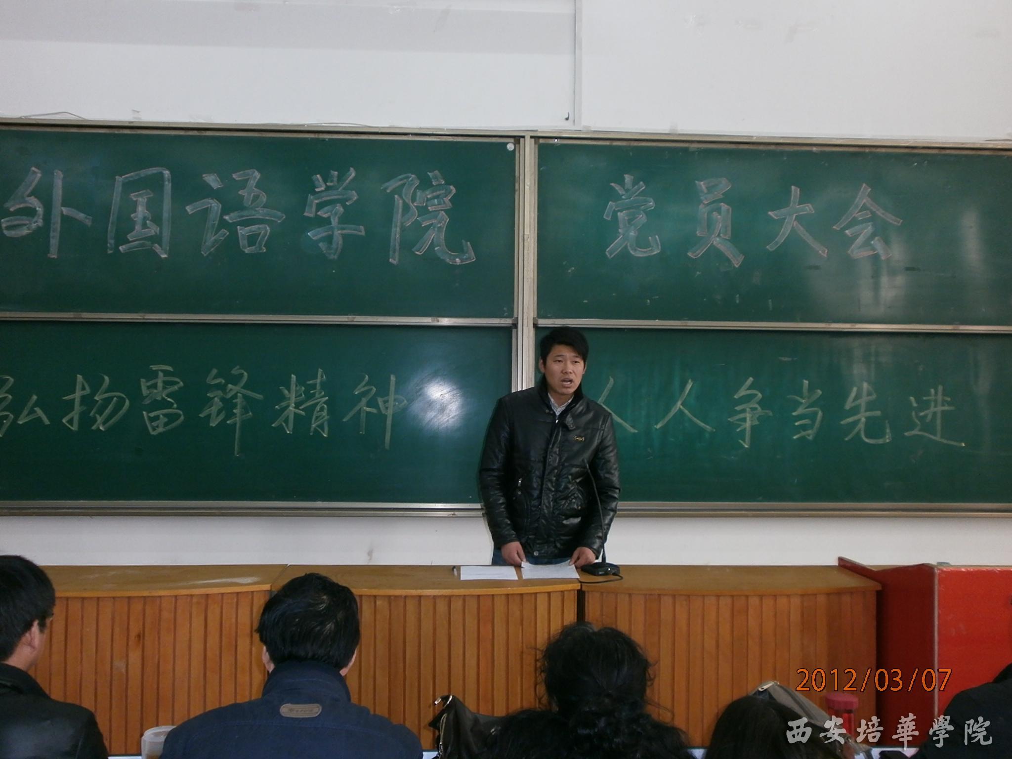 为了进一步弘扬雷锋精神,掀起积极分子、党员争先创优的高潮,外国语学院于2012年3月7日中午12:00在J101教室隆重召开“弘扬雷锋精神、人人争当先进”党员大会。会议由党总支委员、学生科长吴维东主持,院党总支副书记兼院长助理马平安老师,党总支委员陈曦 、贾卉、蔡亮以及各辅导员老师和外国语学院全体学生党员、预备党员以及低年级入党积极分子共同参加了会议。