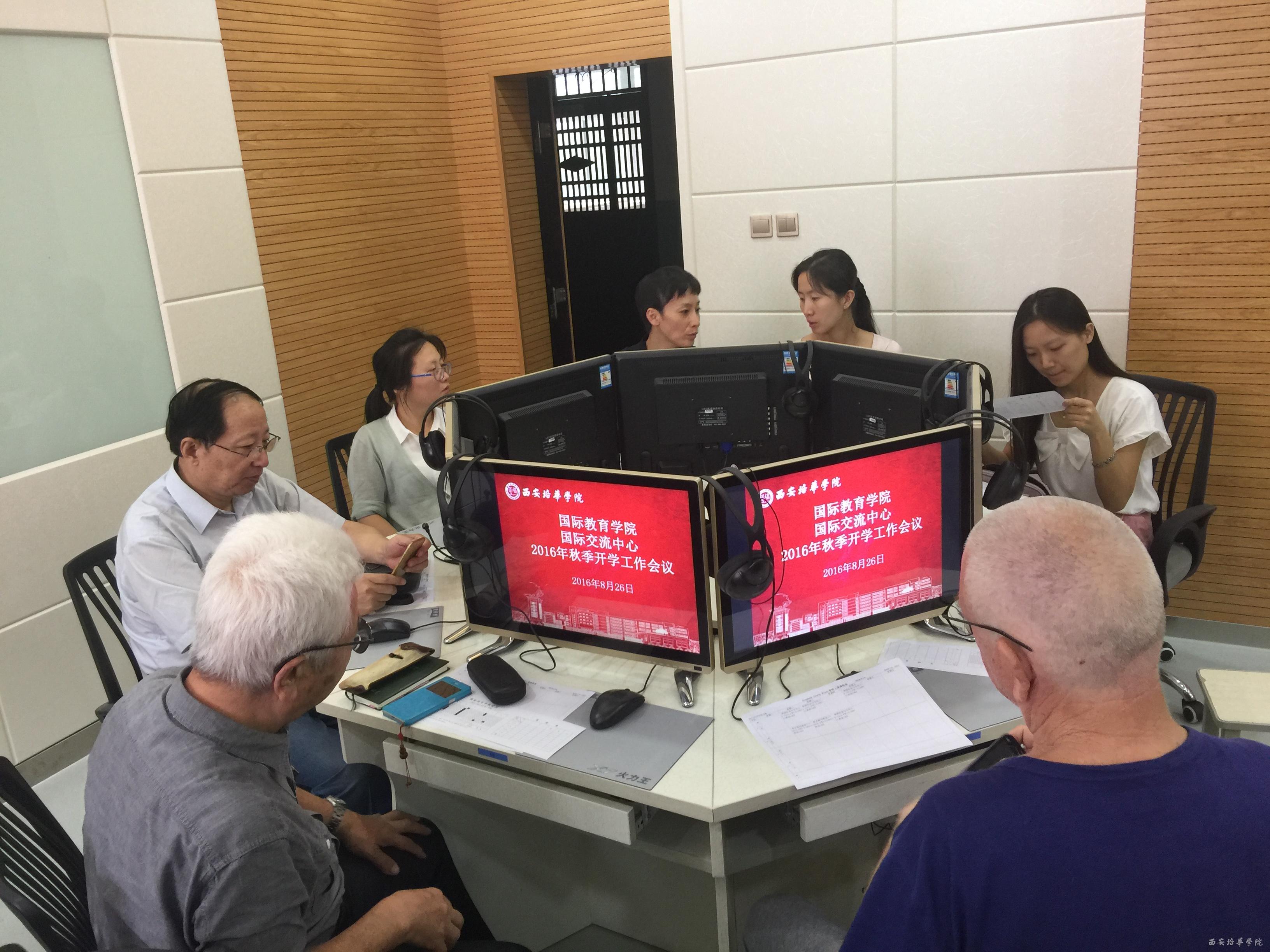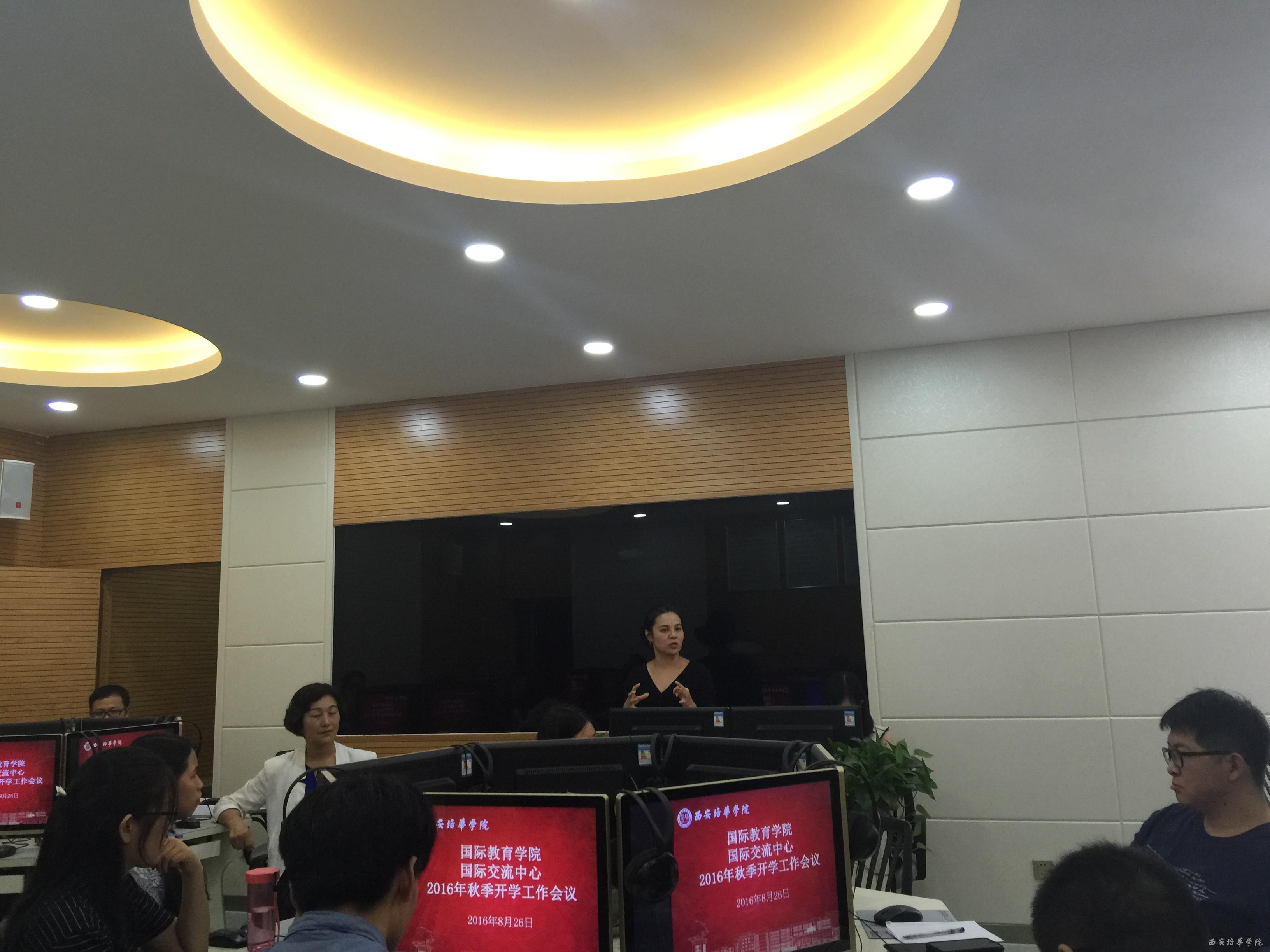 国际教育学院,国际交流中心于8月26日下午在一号楼1202教室召开2016学年秋季工作会议,会议由王鹏副院长主持。王院长首先对刘越莲副校长出任国际教育学院院长表示热烈欢迎,刘教授表示非常高兴融入国教院这个年青富有活力的团体,愿带领大家扎扎实实做好各项工作。接下来王副院长就整个学年的工作进行了布置,强调英语系的评估是近期工作关键,要认真做好新生入学的接待工作,第一周要开好头,同时对国际交流中心的工作进行了安排。梁蕊书记就学工工作进行了安排,确定了学业导师,生活导师的人选与工作细则。国际教育学院全体专兼职教师,外教参加了会议。