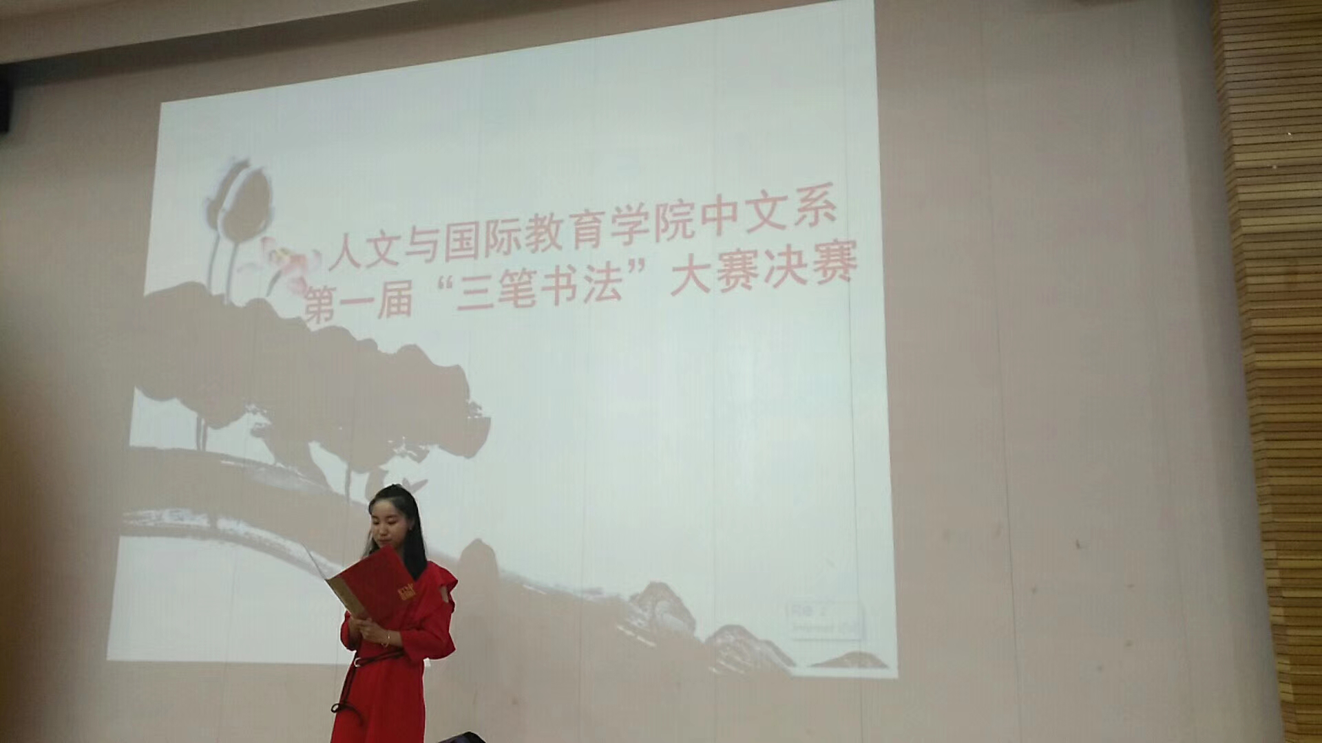 行楷隶篆见功夫,书法艺术耀光辉,中文学子齐欢聚, 大赛风采竞风流。2019年6月5日下午4:30,人文与国际教育学院中文系在格物楼J101举行中文系第一届“三笔书法”大赛的决赛。中文系学科带头人仵埂教授、中文系主任张静副教授莅临本次比赛现场。担任本次决赛评委的老师分别是中文系陈卫东老师、王相民老师、高天成老师。中文系全体教师及学生参加了本次活动。 本次大赛由中文系贾晶老师负责组织工作。