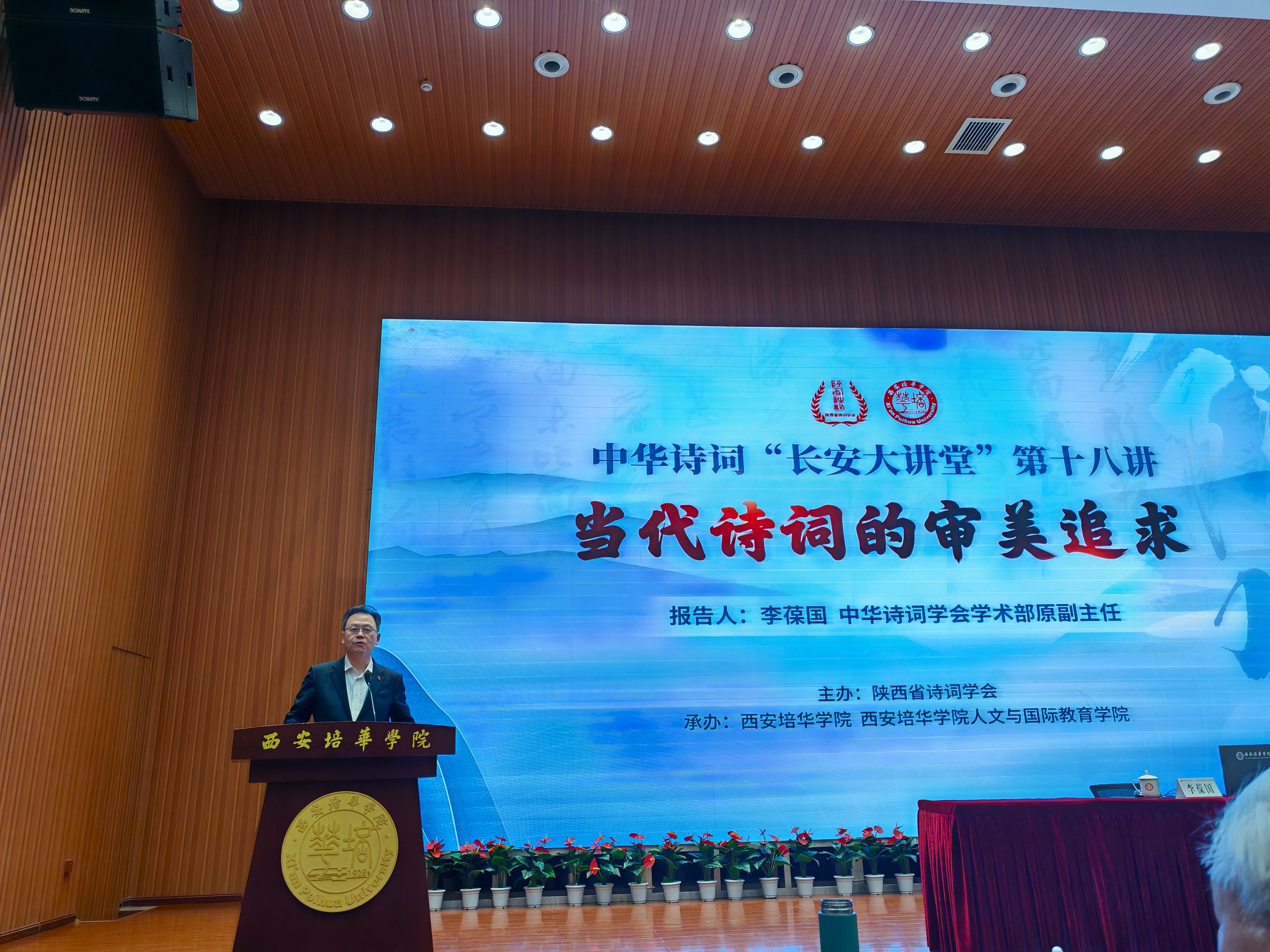 2025年3月15日,由陕西省诗词学会主办,西安培华学院、西安培华学院人文与国际教育学院承办的中华诗词“长安大讲堂”第十八讲,在我校维之图书馆报告厅成功举办。本次讲座的主题为“当代诗词的审美追求”,由中华诗词学会学术部原副主任李葆国先生担任主讲嘉宾。来自全国各界的诗词爱好者、西安培华学院人文与国际教育学院中文系全体教师以及人文与国际教育学院部分学生,共计400余人参加了此次讲座。